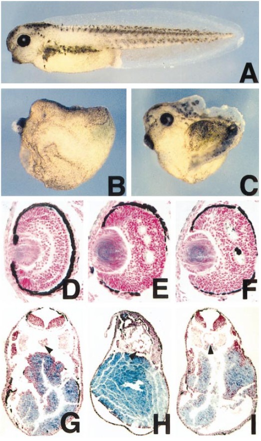 FIG. 8. Overexpression of Sfrp-2 and Frzb dorsalises the Xenopus embryo. One ventralblastomere of the four-cell staged Xenopus embryo was injected with 1 ng of RNA. (A) Uninjected stage 36 embryo. (B) Sfrp-2-injected embryo lacking posterior structures (e.g., tail). This embryo also has head defects, which were seen in 25% of the embryos, including poor differentiation of the eye. (C) Frzb-injected embryo lacking posterior structures (e.g., tail). In contrast to Sfrp-2-injected embryos, these embryos did not show head defects. (D) Section of a normal eye from an uninjected embryo. Note the three-layered structure of the retina. (E and F) Sections of abnormal eyes from Sfrp-2- (E) and Frzb- (F) injected embryos. Note the disrupted organisation of the retina. (G) Sections through control (G), Sfrp-2-injected (H), and Frzb-injected (I) embryos. The notochord is arrowed in (G). Note the highly enlarged notochord in the Sfrp-2-injected embryo.