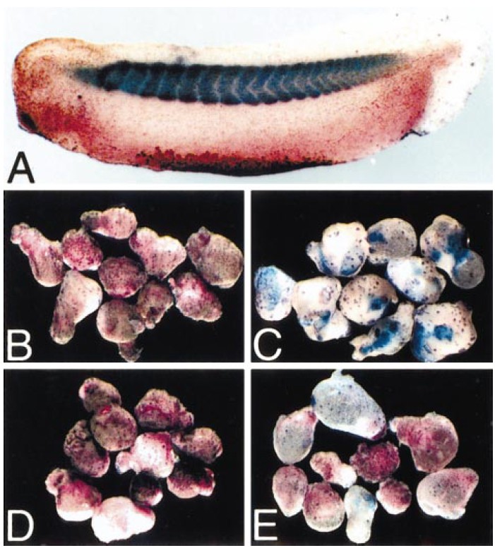 Ventral marginal zone explants were taken from embryos that were injected with the indicated mRNAs, and muscle was detected by whole-mount immunolocalisation using the muscle-specific 12/101 antibody and is stained blue, whilst globin, a ventral marker, is shown by red staining. (A) Control whole embryo showing normal 12/101 localisation in the somites and globin ventrally. (B) Uninjected ventral marginal zone explants do not contain any muscle. (C) Xwnt-8-injected (20 pg) ventral marginal zones differentiate muscle. (D and E) Co-injection of either Sfrp-2 (2 ng) (D) or Frzb (2 ng) (E) blocks most muscle differentiation in Xwnt-8-injected (20 pg) ventral marginal zones.