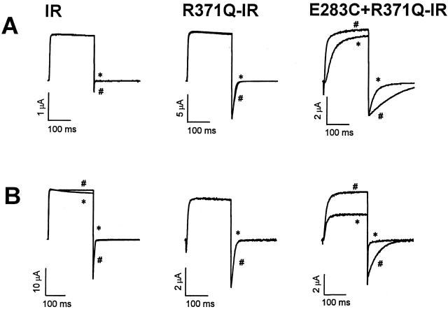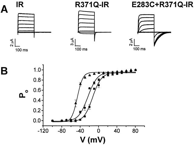 Using a strategy related to intragenic suppression, we previously obtained evidence for structural interactions in the voltage sensor of Shaker K(+) channels between residues E283 in S2 and R368 and R371 in S4 (Tiwari-Woodruff, S.K., C.T. Schulteis, A.F. Mock, and D. M. Papazian. 1997. Biophys. J. 72:1489-1500). Because R368 and R371 are involved in the conformational changes that accompany voltage-dependent activation, we tested the hypothesis that these S4 residues interact with E283 in S2 in a subset of the conformational states that make up the activation pathway in Shaker channels. First, the location of residue 283 at hyperpolarized and depolarized potentials was inferred by substituting a cysteine at that position and determining its reactivity with hydrophilic, sulfhydryl-specific probes. The results indicate that position 283 reacts with extracellularly applied sulfhydryl reagents with similar rates at both hyperpolarized and depolarized potentials. We conclude that E283 is located near the extracellular surface of the protein in both resting and activated conformations. Second, we studied the functional phenotypes of double charge reversal mutations between positions 283 and 368 and between 283 and 371 to gain insight into the conformations in which these positions approach each other most closely. We found that combining charge reversal mutations at positions 283 and 371 stabilized an activated conformation of the channel, and dramatically slowed transitions into and out of this state. In contrast, charge reversal mutations at positions 283 and 368 stabilized a closed conformation, which by virtue of the inferred position of 368 corresponds to a partially activated (intermediate) closed conformation. From these results, we propose a preliminary model for the rearrangement of structural interactions of the voltage sensor during activation of Shaker K(+) channels.