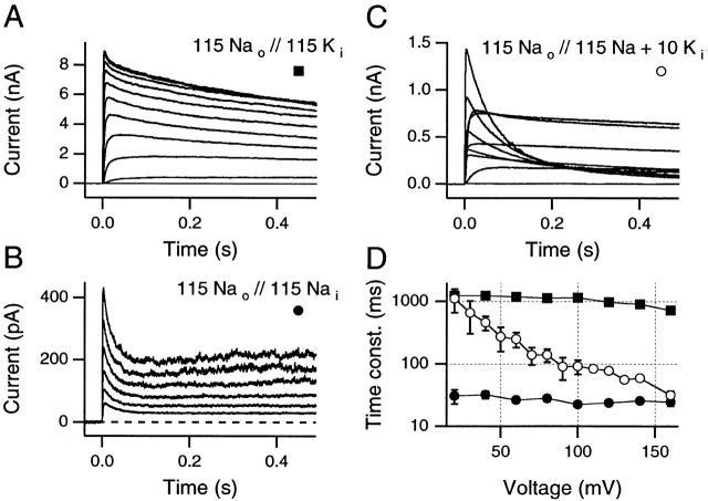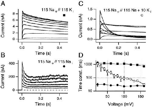 Figure 1. Slow inactivation rates can become steeply voltage sensitive when high Na+, low K+, internal solutions are used. (A) With 115 mM [Na+] externally and 115 mM [K+] internally, slow inactivation rate is essentially voltage insensitive for test potentials between +20 and +160 mV (traces shown: −20 to +160 mV, 20-mV steps, 5-s interpulse intervals). (B) Despite a marked increase in the rate of slow inactivation in symmetric Na+ solutions, the slow inactivation rate remains insensitive to the test potential (traces shown: +40 to +140 mV, 20-mV steps, 5-s interpulse intervals). (C) Slow inactivation is steeply voltage sensitive when 10 mM of K+ is added to the internal solution used in B (traces shown: −60 to +120 mV, 20-mV steps, 5-s interpulse intervals). (D) Time constants for all three conditions for test potentials from +20 to +160 mV. ▪, 115 Nao//115 Ki as in A (mean data from three to five patches). •, 115 Nao//115 Nai as in B (mean data from two to four patches). ○, 115 Nao//115 Nai + 10 Ki as in C (mean data from three patches, except at +160 mV, where n = 14 patches). Standard deviations are visible only when they exceed the size of the data symbol. All data are from inside-out patches. |