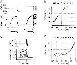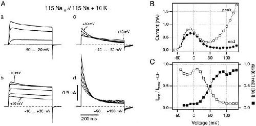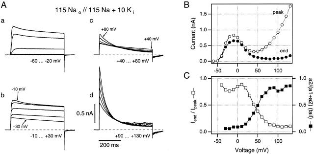 Figure 2. A family of macropatch currents recorded from ShΔ channels expressed in Xenopus oocytes, using a high [Na+], low [K+] internal solution. (A, a–d) Individual current traces are shown for groups of five test potentials to minimize the ambiguity produced by overlapping traces. (B) Peak current magnitudes (○) give an N-shaped peak I-V curve, while end currents (•) fail to increase at potentials greater than +20 mV, indicating steadily increasing slow inactivation in this 500-ms time window at these test potentials. (C) Iend/I peak (□) and the relative increase in magnitude of slow component of the tail current (▪) are plotted against the test potential to give quantitative estimates of steady state slow inactivation at these potentials. Symbols in B and C are connected by straight lines. All data are from the same inside-out patch as in Fig. 1 C. Traces recorded using 5-s interpulse intervals. |