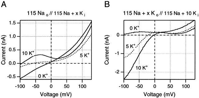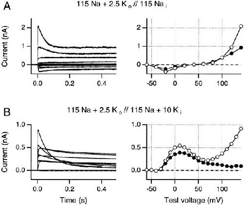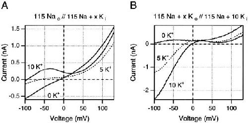Figure 7. Effects of changes in K+ concentrations on ramp I-V curves after 5-ms test pulses to +160 mV (A) or +140 mV (B). (A) Effects of changes in internal K+ concentration in one inside-out patch. Note that the outward currents at positive potentials are highest in absence of internal K+ and fall when low K+ concentrations are added to the internal solution. (B) Effects of changes in external K+ in one outside-out patch. Changes in outward currents are small relative to the changes in inward currents at negative potentials. See text for full discussion of these results. Data in A are from one inside-out patch, data in B are from one outside-out patch. |