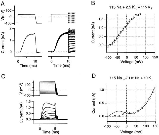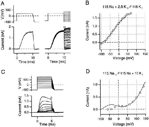Figure 4. (A and B) Comparison of instantaneous I-V curves and reversal potentials obtained from 1-ms ramps and by the standard tail current method, evaluated in high internal K+ solution (A, top) The pulse protocols illustrate the 1-ms downward ramps from +40 as well as corresponding protocols for the recording of instantaneous tail currents. (Bottom) Ionic currents obtained from an outside-out patch using solutions indicated in B. Data were recorded with a sample interval of 10 μs, digitally low-pass filtered at 20 kHz. (B) Comparison of ramp I-V data from +40 mV to −100 mV (solid line) with instantaneous tail current I-V data (○) from the data shown in A. (C and D) Comparison of instantaneous I-V curves from 1-ms ramps with the N-shaped test pulse I-V curve, evaluated in a high internal Na+ solution with 10 mM added K+. (C, top) The pulse protocols are indicated; note that in low internal K+ concentration, yielding faster inactivation, short (5-ms) depolarizing pulses were used. All records were leak- and capacitative-current subtracted using on-line −P/n pulses. (Bottom) Ionic currents obtained from an inside-out patch using the solutions indicated in D. (D) Comparison of ramp I-V data from +160 to −100 mV (solid line) with test pulse peak current I-V data (○) from the data shown in C. Note the N-shaped I-V curve for both the ramp and the test pulse I-V curves. All data were obtained using 5-s interpulse intervals. |