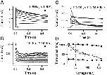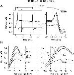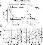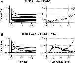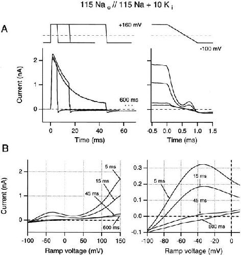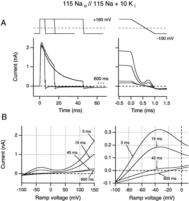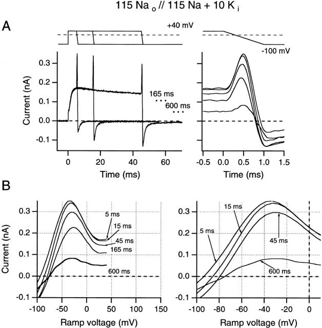 Figure 6. Effects of increasing test pulse duration on ramp I-V curves recorded after test pulses to +160 mV. (A) Ramp currents are plotted against time. (B) Ramp currents are plotted against ramp potential. Same format as in Fig. 5. All data are from the same inside-out patch as in Fig. 5. |