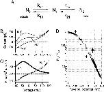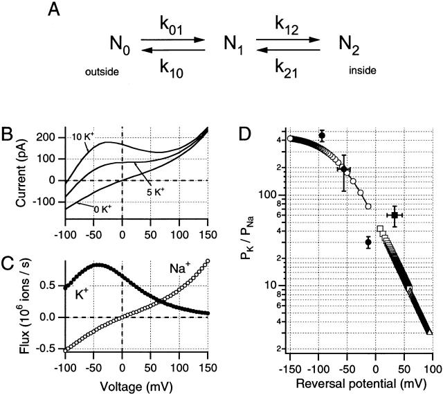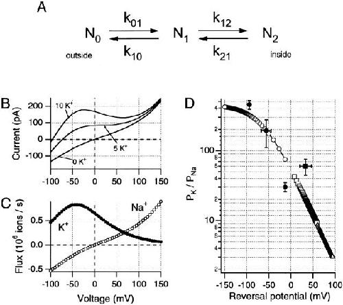 Figure 8. A simple single-site Eyring barrier model can be used to demonstrate voltage-dependent changes in PK/PNa ratio. Parameters of the model used here can be described in relation to a simple kinetic scheme (A) in which N0, N1, and N2 represent the external, intramembrane, and internal energy wells, respectively; where k01 and k10 are the forward and backward rate constants between N0 and N1, and k12 and k21 are the equivalent rate constants between N1 and N2. Values for these rate constants are shown given for both Na+ and K+ ions at 0 mV and the solutions used for the data in Fig. 7 A. Rate constants (sâ1): (Na+) k01, 2.77 à 10+8; k10, 1.13 à 10+5; k12, 2.05 à 10+8; k21, 5.01 à 10+11; (K+) k01, 1.84 à 10+11; k10, 4.57 à 10+8; k12, 6.18 à 10+7; k21, 2.49 à 10+11. To calculate the rate constants at other potentials, it is necessary to define the placements of the barriers and wells within the transmembrane field. For the model used here, N0 and N2 were presumed to be at 0 and 100% of the electrical distance from the external side of the membrane, while N1 was set at 45% of this distance. Internal and external energy barriers were placed at 10 and 90% of the transmembrane field, respectively. (B) Simulations of changes in internal K+ concentrations approximate the data shown in Fig. 7 A, when the same internal and external solutions are used. For this simulation, the patch was presumed to contain 1,500 channels. (C) Predicted single-channel Na+ and K+ fluxes were generated by this model for the 10-mM internal K+ condition, suggesting voltage-dependent changes in relative permeabilities. (D) PK/PNa ratios obtained from predicted reversal potentials for this model under different ionic conditions. (â) Simulations with 115 Nao//115 Nai and differing internally, (â¡) variable external [K+]. âµ were obtained from simulations using internal 11.5 mM Na+, external 115 mM Na+, and variable K+. Experimental values obtained in this study are shown as filled symbols (mean ± SD): â¢, Na+o//Na+i + variable K+; âª, Na+o + 2.5â10 mM K+o//Na+i. |