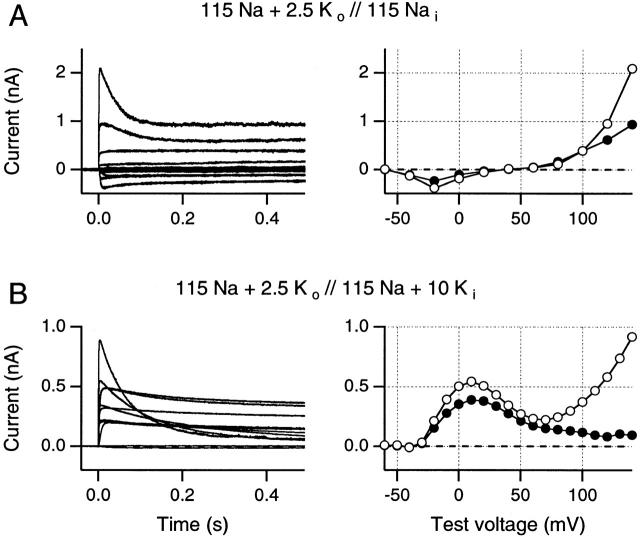Figure 3. Current families were obtained using a K+-free internal Na+ solution (A) and, in a different patch, following addition of 10 mM internal K+ (B). Holding potential was −80 mV and currents were recorded using on-line −P/n protocols for leak and capacity current subtraction. Test pulse voltages increased by 20-mV increments in A and by 10-mV increments in B. (A) In the absence of internal K+ ions, all outward currents are carried by Na+ ions. Both peak Na+ currents (○) and steady state outward Na+ currents (•) increase steeply at potentials greater than +80 mV. Inactivation becomes readily apparent only at the most positive potentials. (B) In the presence of internal K+ ions, peak currents (○) increase to a maximum at +10 mV, followed by a region of negative slope conductance between +20 and +70 mV. At potentials greater than +80 mV, peak currents rise steeply again, just as in A. However, end currents fall steadily at potentials greater than +10 mV (•). Symbols are connected by straight lines. Data in A and B were obtained from two different inside-out patches. All traces recorded using 5-s interpulse intervals. |