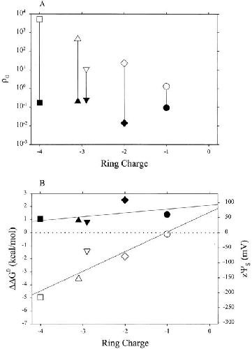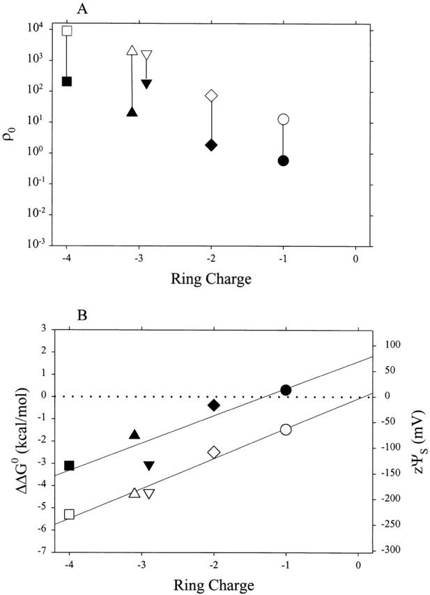 Figure 6. ρ0 and ΔΔG 0 for MTSEA and MTSEH as a function of ring charge. (A) The ratio of the rate constants for the reactions with the receptor was divided by the ratio of the rate constants for the reactions of MTSEA and of MTSEH with 2-mercaptoethanol in solution, thereby normalizing for the difference in the intrinsic reactivities of the two reagents (Pascual and Karlin 1998). This ratio of ratios, ρ0, is plotted versus the ring charge. Rate constants for the reactions of the mutant receptors in the presence (unfilled symbols) and absence (filled symbols) of ACh, at zero transmembrane potential, are from the data in Fig. 5. The symbols correspond to the same combinations of subunits as in Fig. 2. (B) ΔΔG 0 was calculated as −RTln(ρ0) and zψS was calculated as ΔΔG 0/F. |