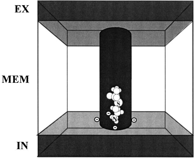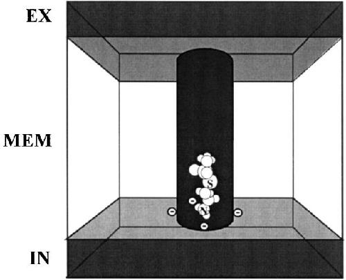 Figure 8. A simple model of the open channel. A cylindrical pore of 8-Å diameter and 30-Å length crosses a slab representing the bilayer and the bilayer-embedded receptor. Water is on either side of the slab and within the channel (dark fill). The water has a dielectric constant of 80, and the slab (no fill) has a dielectric constant of 2. Measuring along the long axis (x axis) of the channel from its midpoint, the intracellular end is at x = −15 Å and the extracellular end is at x = 15 Å. Point charges are placed at the vertices of a pentagon at x = −14 Å and at a distance from the x axis (r coordinate) of 5 Å. A model of MTSEA is shown in the channel with the positively charged ammonium centered at r = 0 Å, x = −14 Å. The point charges were given values of −1 or 0. The closed channel includes as a gate, a disc of dielectric constant 2, 8-Å diameter and 2-Å thick, from x = −12 to −14 Å. EX, extracellular; IN, intracellular; MEM, membrane. |