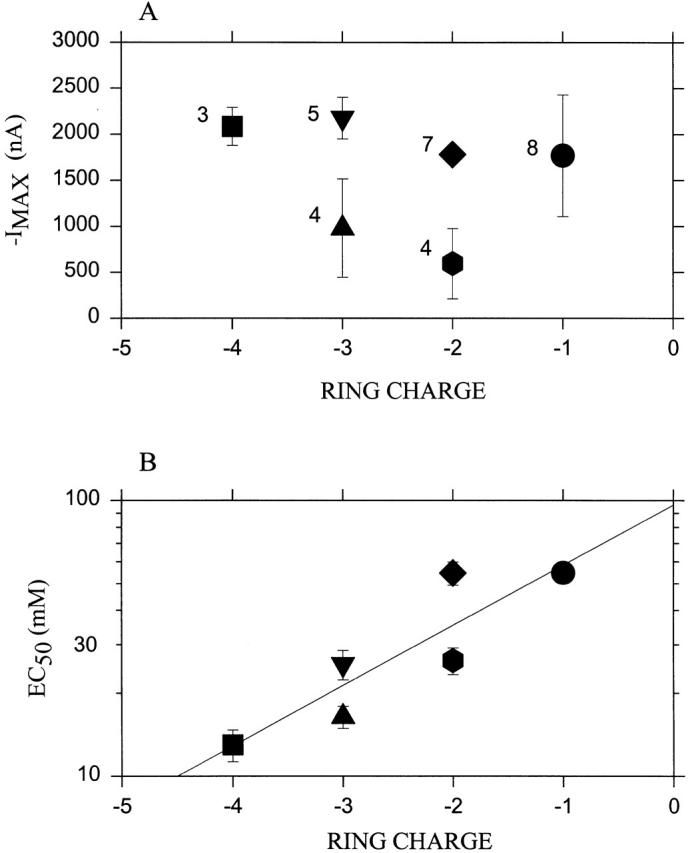Figure 2. Responses of complexes of subunits mutated in the Glu ring. Oocytes were injected with all four types of subunits. In all cases, α contained the mutation T244C; this is designated α− if E241 is not also mutated, and α0 if in addition E241 is mutated to Q (i.e., the superscript indicates the charge of the residue in the position of the Glu ring). Wild-type β is designated β−; β with the mutation E252 to Q is designated β0; and β with the mutation E252 to K is designated β+. Wild-type γ is designated γ0. Wild-type δ is designated δ−, and δ with the mutation E255 to Q is designated δ0. The complexes tested were: α−2β−γ0δ− (i.e., a pseudo wild type with only αT244 mutated to C; ring charge, −4; square); α−2β0γ0δ− (ring charge, -3; up triangle); α−2β−γ0δ0 (ring charge, −3; down triangle); α02β−γ0δ− (ring charge, −2; diamond); α−2β+γ0δ− (ring charge, −2; hexagon); and α02β0γ0δ− (ring charge, −1; a circle). (A) The average maximum current (−IMAX) obtained from the fit of the Hill equation to the responses at various concentrations of ACh. (B) The average EC50 obtained from the fit of the Hill equation. The least-squares linear fit to the log(EC50) is shown. In each case, the abscissa is the sum of the charges in the ring. The numbers of independent experiments are indicated next to the symbols. The bars represent the standard errors of the means. |