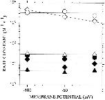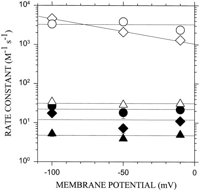 Figure 4. Second-order rate constants for the reactions of thiosulfonate reagents with α02β0γ0δ− as a function of the transmembrane potential. The rate constants were determined as in Fig. 2 for MTSEH (triangle), MTSEA (circle), and AEAETS (diamond) in the absence (filled symbols) and presence (unfilled symbols) of ACh, at various holding potentials. In each case, the mean ± SEM is plotted for recordings from three to four cells. |
