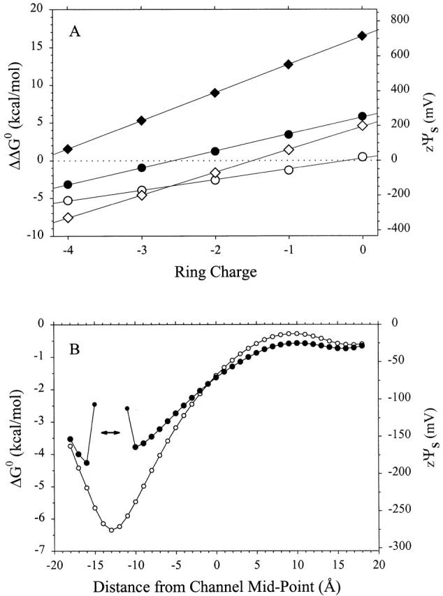 Figure 9. Electrostatic free energies of transfer into the model channel. (A). The differences (ΔΔG 0) in the ΔG 0 of MTSEA and MTSEH (circles) and of AEAETS and MTSEH (diamonds) are shown for both the open (unfilled symbols) and closed (filled symbols) states. In the open state, MTSEA was oriented as in Fig. 8, with the ammonium N at x = −14 Å, r = 0 Å. The ammonium of AEAETS closest to the -S− was placed at r = 0 Å and x = −14 Å, and the second ammonium closest to the -SO2− was at r = 0 Å and x = −4.4 Å. The hydroxyl hydrogen of MTSEH was placed in the same location as the ammonium of MTSEA, and the orientation of the molecule was similar. In the closed state, the head groups of the reagents were moved to x = −10 Å, while the orientations were unchanged. (B). ΔG 0 for the transfer of a Na+ from the extracellular solution to the channel was calculated at 1-Å intervals, from x = −18 to 18 Å. (The channel extends from −15 to 15 Å.) In the closed state, the Na+ was excluded from the gate, which extends from x = −14 to −12 Å (double-headed arrow). |