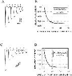 Figure 3. Kinetics of the reaction of MTSEA with the Cys at α244 exemplified with α02β0γ0δ−. MTSEA was applied to oocytes expressing α02β0γ0δ− in both the closed (A and B) and open (C and D) states at a holding potential of −50 mV. The sequence of applications to the oocytes was: 200 μM ACh for 10 s; bath solution for 3 min; 5 mM MTSEA for 2–16 s (beginning at arrows) for the closed state (A) or 50 μM MTSEA together with 200 μM ACh for 5–20 s (arrows) for the open state (C); bath solution for 3 min. This sequence was repeated several times, resulting in cumulative applications of MTSEA for the times shown under the peaks of the test responses to ACh. There was no decline in current during the 10-s applications of ACh; the return of the current to baseline began with the wash out of ACh. The peak current was normalized and plotted against the cumulative MTSEA exposure time in the absence (B) and presence (D) of ACh. Solid lines indicate least squares single exponential fits to the data, which yield the pseudo first- and second-order rate constants for the reactions (see materials and methods). |