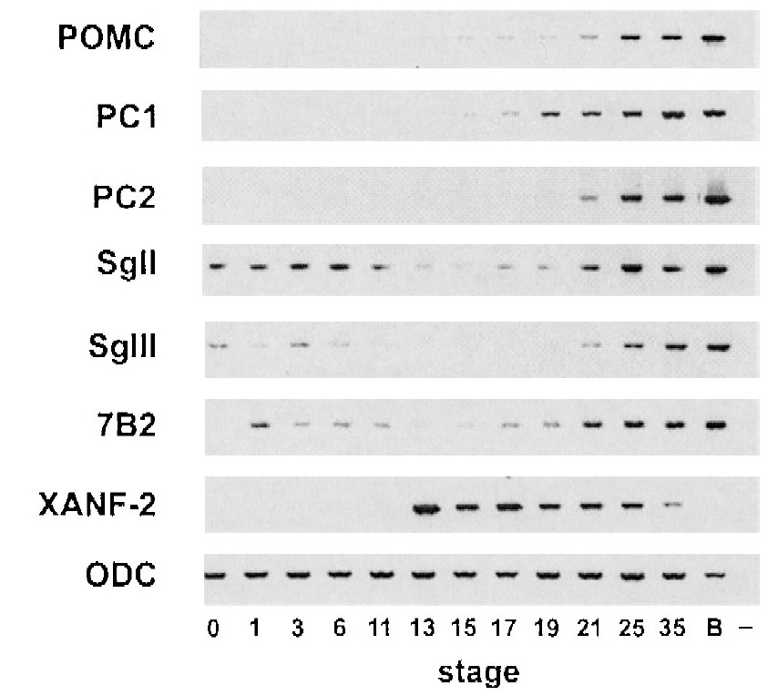 Differential onset of expression of mRNAs encoding proopiomelanocortin, prohormone convertases 1 and 2, and granin family members during Xenopus laevis development.