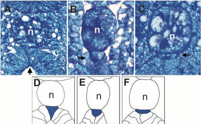 (C) Stage 24. The mostdorsal cell is now flattened against the dorsalmost periphery of the endodermal epithelium and lies at an angle to the adjacent columnar endoderm cells. (D-F) Traced outlines of sections A-C showing position of the prehypochord cell (blue) within the dorsal endoderm. n, notochord; arrow, prehypochord cell.
