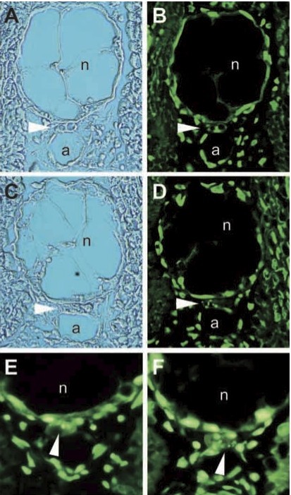 Fig. 4. Nuclei in the degenerating hypochord show characteristics of apoptosis. Nuclei are detected by SYTOX green staining. Highly condensed chromatin and nuclear fragmentation are evident along the hypochord of stage-41 and -42 embryos. All sections are transverse through the trunk. (A) Bright-field and (B) fluorescence views of section through the hypochord of a stage-38 embryo. An intact nucleus is evident in the hypochord in this section (white arrowhead) and nuclear morphology is similar to other embryonic cells. (C) Bright-field and (D) fluorescence views of a section through the hypochord of a stage-41 embryo. Notice the nuclear fragmentation evident in the hypochord cell nucleus (white arrowhead). (E,F) Higher magnification views of sections through the hypochord of stage-42 embryos. Note fragmented nuclei in the hypochord (white arrowheads). n, notochord; a, dorsal aorta.