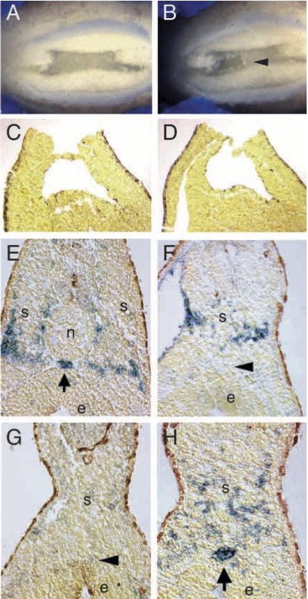 Fig. 5. Removal of notochord at stage 13-14 results in the failure of hypochord development. (A) Stage-14 embryo showing removal of notochord. Note that the endodermal cell layer is intact in this embryo. (B) Embryo with notochord removed showing clear damage to the endodermal layer (arrowhead). (C,D) Transverse sections through embryos following notochord removal, showing intact and damaged endodermal cell layers, respectively. Only embryos showing an intact endodermal layer were assayed in subsequent experiments. (E-H) Transverse sections through the posteriortrunk of stage-30 embryos assayed for VEGF expression by in situ hybridization. (E) Section through an unmanipulated embryo. The hypochord is located ventral to the notochord. VEGF expression is evident in the hypochord (short arrow) and the somites.