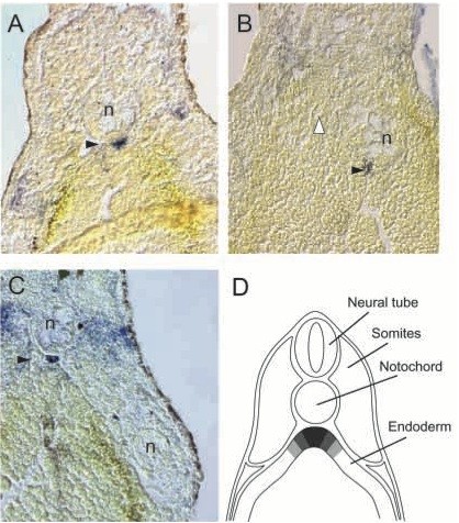 Fig. 7. The ability to form hypochord is restricted to dorsal endodermal cells. (A) Section through a stage-30 embryo showing VEGF expression (black arrowhead) in developing hypochordtissue, immediately ventral to the endogenous notochord (n). (B) Section through stage-30 embryo in which the endogenous notochord (n) has been displaced laterally at stage 14. The open arrowhead indicates the place where the notochord would normally be located. VEGF expression (black arrowhead) is visible in endodermal cells adjacent to the displaced notochord. (C) Section through a stage-30 embryo in which a second notochord was grafted lateral to the somite, immediately adjacent to the lateral plate mesoderm. The transplant was performed at stage 14. VEGF expression in hypochordtissue adjacent to the endogenous notochord is evident (black arrowhead). No ectopic VEGF staining or hypochord structure is visible adjacent to the ectopic notochord. Although the notochord in this example is slightly separated from the endoderm, examination of multiple embryos failed to reveal VEGF staining in lateralendoderm, even when the transplanted notochord was in immediate contact. (D) Diagram showing the approximate locations of endodermal cells capable of forming hypochord in response to notochord signaling. The shading indicates a diminishing ability to form hypochord in more lateral endodermal tissues.