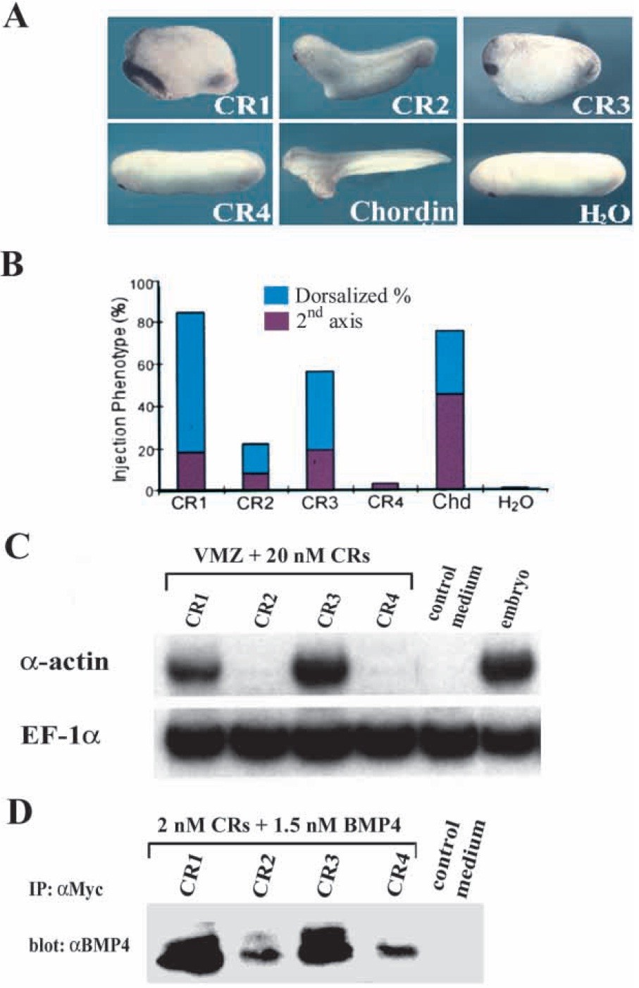 Fig. 4. CR1 has less activity than full-length Chordin. (A) RT-PCR analysis of dorsalization of ventral