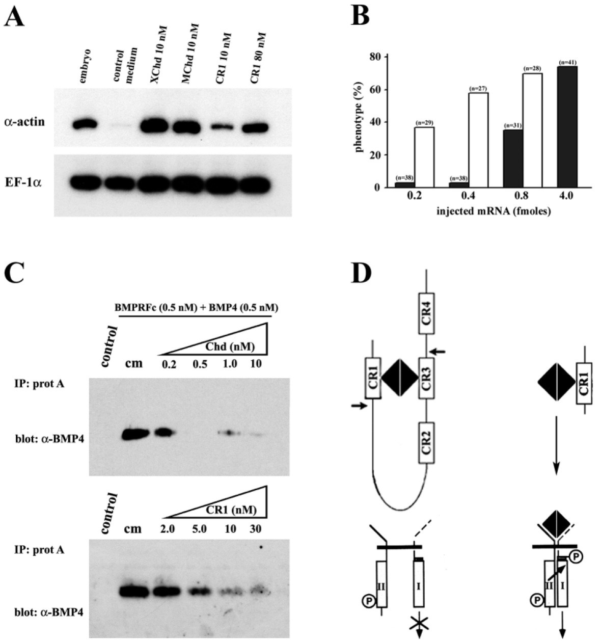 chordin is more active than CR1. (C) Binding of BMP4 to a BMPR-Fc fusion protein is competed