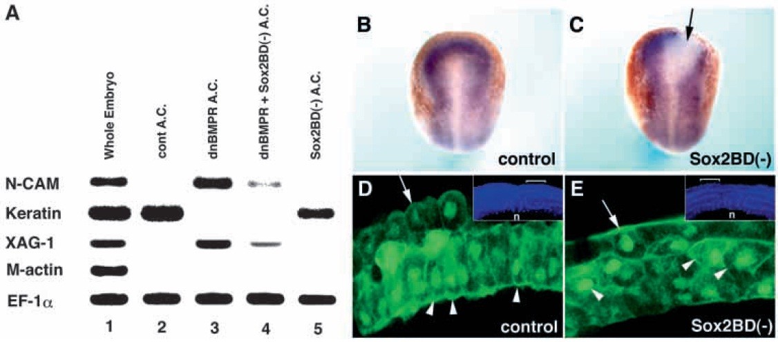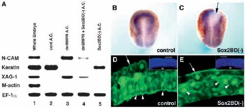 sequence to the carboxyl terminus of Sox2BD(-) (A, bottom). (B) N-CAM expression in animal caps neuralized with dnBMPR. Application of