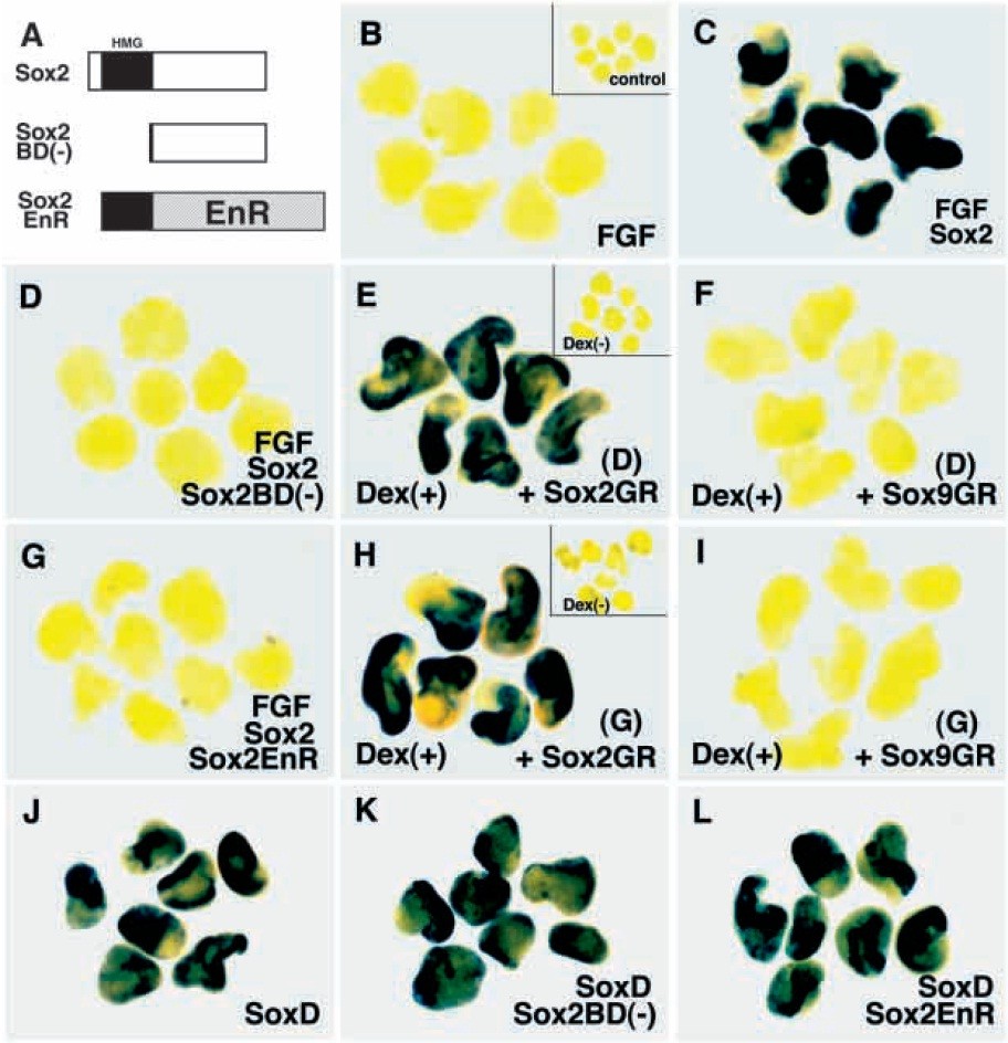 medium from stage 9 onwards (F), stage 12 (G) or stage 14 onwards (H). (I-L) 200 pg of Sox2BD(-)-GR mRNA was injected into each animal