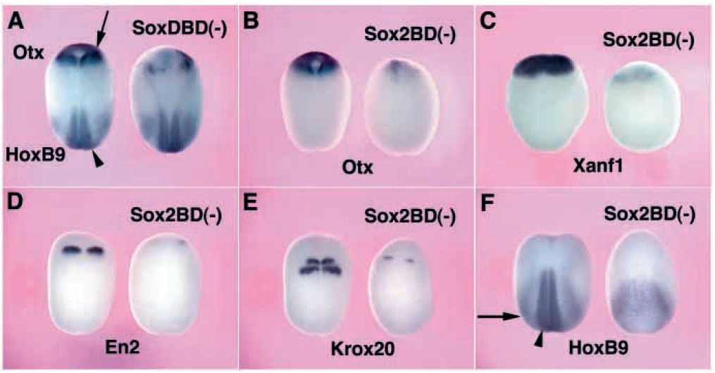of Sox2BD(-) inhibited expression of Otx2 (B), Xanf1 (C), En2 (D), Krox20 (E), and HoxB9 (F). Note that inhibition of HoxB9 expression was