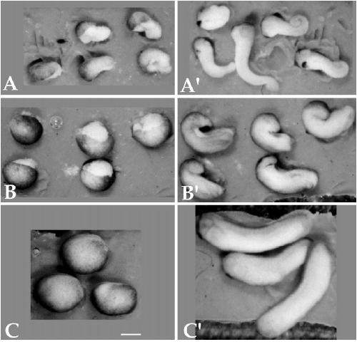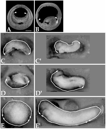 FIG. 2. Ventral explants lengthen autonomously. Photomicrographs of the same dorsal explants (A and A9), ventral explants (B and B9), and