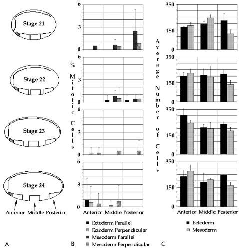 of ventral ectoderm and mesoderm of identical dimensions and locations were surveyed for mitotic figures at stages 21 through 24 (A). Each
