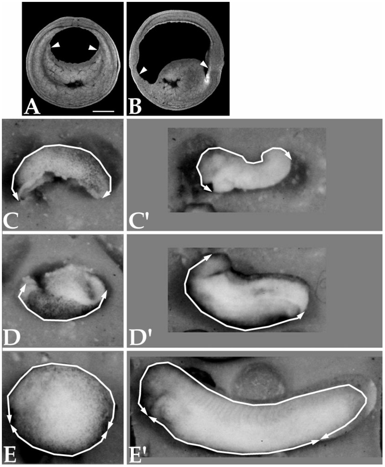 pigmented upper surface (D), and stage 16 embryo (E). Video micrographs of the same dorsal explant (C9), ventral explant (D9), and embryo (E9)