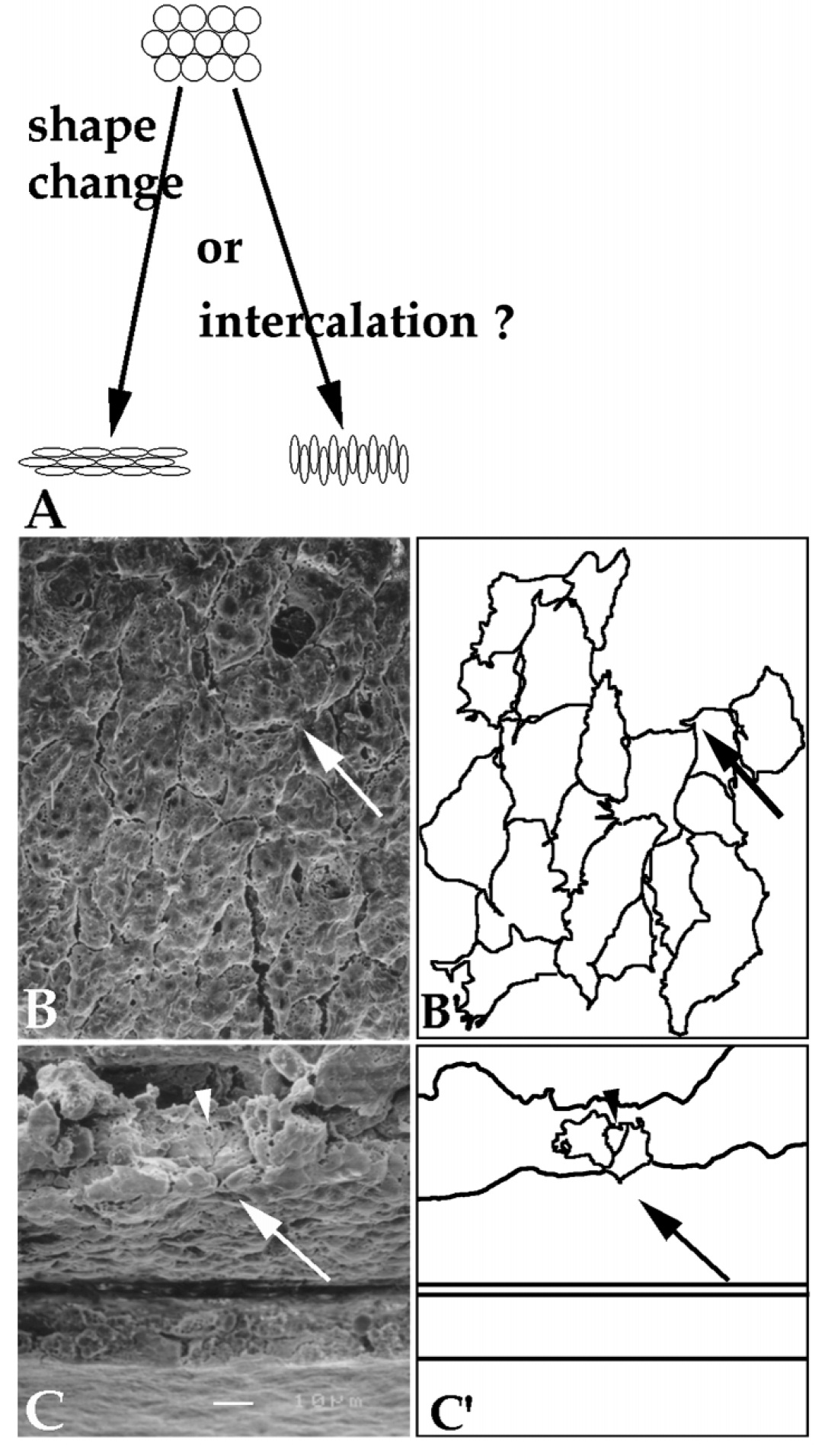 perpendicular to the A-P axis. Note the rosette arrangement at the upper right (B, arrow). Traced cell outlines of cells in B to illustrate