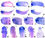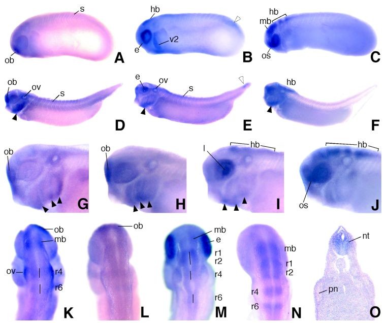 Figure 6. Comparison of the spatial expression patterns of ephrin-B genes in tailbud and tadpole stage Xenopus embryos. Whole-mount in situ hybridizations were performed to detect expression of ephrin-B1 (A, D, H, L), ephrin-B2 (B, E, I, M), ephrin-B3 (C, F, J, N, O), and EphB4 (G, K). Embryos at stages 26 (A) and 36 (D) and heads of stage 31 embryos (G) are shown as lateral views. Dorsal views of stage 26 embryos are shown in (K). The section shown in (O) was cut at 50 μm. (A, D) Ephrin-B1 transcripts were initially detected in the developing olfactory bulb (ob) and the somites (s). Faint staining was observed throughout the brain. Later, ephrin-B1 expression was also found in the visceral arches (arrowhead), and the otic vesicle (ov). (B, E) Ephrin-B2 was initially expressed in the eye vesicle (e), the hindbrain (hb), the second visceral arch (v2), and the newly forming somites of the tail (white arrowhead). In older embryos, transcripts could also be seen in the somites (s) of the trunk and the visceral arches (arrowhead). (C, F) Ephrin-B3 was expressed in the optic stalk (os), the midbrain (mb), and in rhombomeres of the hindbrain (hb). At later stages, transcripts were also detected in the visceral arches (arrowhead). (G) Comparison of EphB4 and ephrin-B gene expression in the heads of stage 31 embryos. Gene expression in the region of the developing olfactory bulb (ob), the hindbrain (hb), the lens (l), the optic stalk (os) and the visceral arches (arrowheads) is indicated. (K) Comparison of EphB4 and ephrin-B gene expression in the mid- and hindbrain regions of stage 26 embryos. (K) EphB4 is found in the midbrain (mb), around the otic vesicle (ov), and the olfactory bulbs (ob). Faint staining could also be seen in rhombomeresr4 and r6. (L) Ephrin-B1 transcripts could only be detected in the olfactory bulbs (ob). (M) High levels of ephrin-B2 expression were found in the developing eye vesicles (e) and at lower levels in the midbrain (mb) and rhombomeresr1/r2, r4 and r6. (N) Ephrin-B3 transcripts were detected in the midbrain (mb), and in the hindbrain (r1/r2, r4, and r6). (O) Transverse section cut at the level of the pronephros (pn) of a stage 32embryo. Ephrin-B3 expression was confined to the neural tube (nt).