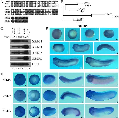 Figure 1. ErbB receptors are expressed during early Xenopus embryogenesis. A: Alignment of the four Xenopus ErbBs in the conserved domain shows that they are homologous to each other, with 65 to 88% identical residues in this region. Shaded residues are identical in all four ErbBs. B: The Xenopus ErbB fragments are highly homologous to their human counterparts in the conserved region in the tyrosine kinase domain, with 94, 93, 82, and 96% similarity between Xenopus EGFR, ErbBs 2, 3, 4, and their corresponding human homologs, respectively. C: RT-PCR analysis shows that all ErbBs are expressed maternally, and the expression persists to at least tailbud stages during early Xenopus development. D: Expression of XErbB2 detected by in situ hybridization. XErbB2 was expressed widely in both ectodermal and mesodermal regions during gastrula and early neurula stages (i-iii). During neurulation (iv) and early tailbud stages (v), its expression was elevated in the neural tissues. Starting from early tailbud stages, its transcripts were also seen in myotomal muscles in addition to neural and neural crest-derived structures, such as brain, spinal cord, eyes, and branchial arches (v-viii). This expression pattern persists to at least tadpole stages (ix). i and ii are animal and vegetal views of mid-gastrula embryos, respectively; iii. iv, and vii are dorsal views of late gastrula, neurula, and tailbud embryos, respectively; v, vi, viii, and ix are lateral views of tailbud and tadpole stage embryos. E: Xenopus EGFR (i-v), ErbB3 (vi-x), and ErbB4 (xi-xv) are expressed widely during early development. At gastrula stages, they were expressed uniformly in ectodermal and mesodermal regions (i, ii, vi, vii, xi, xii), and the expression was increased in the neural tissues during neurulation (iii, viii, and xiii). At tailbud stages, the expression was seen in the brain, spinal cord, brachial arches, somites, eyes, and otic vesicles (iv, v, ix, x, xiv, xv). The embryos were viewed from animal (i, vi, xi) or vegetal (ii, vii, xii) sides at gastrula stages; and from lateral (iii, v, x, xiv, xv) or dorsal (iv, viii, ix, xiii) sides with the anterior to the left for neurula and tailbud embryos. |