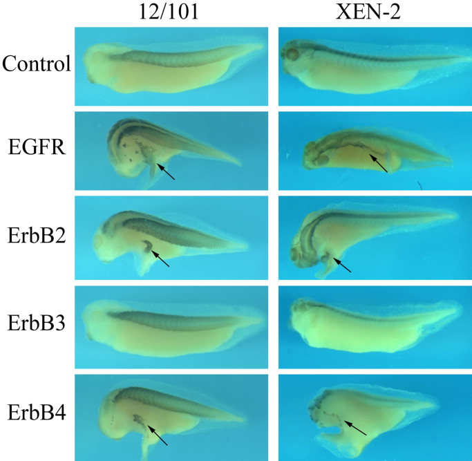 Fig. 4. ErbBs promote expression of differentiated cell markers in the ectopic protrusions. Tadpoles injected with ErbBs (same as in Fig. 2) were analyzed with immunohistochemistry studies using antibodies against a muscle epitope (12/101) and a neural epitope (Xen2). In the ectopic structures induced by EGFR, ErbB2, and ErbB4, both markers were ex- pressed; the new sites of marker expression were often separated from the endogenous ex- pression domains, suggesting a de novo induc- tion of these differentiated genes in the protru- sions. Black arrows point to the ectopic structures |