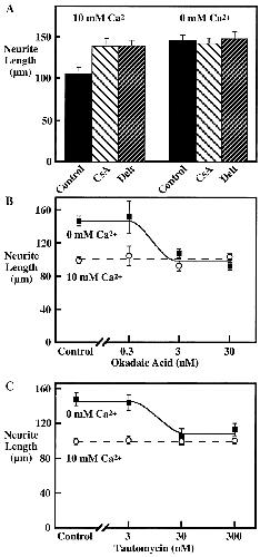 Pharmacological inhibition of CN but not other serâthr phosphatases increases neurite lengths in the presence of Ca2+. A, Neurite lengths are significantly increased by 10 nM CsA or 1 nM DM (Delt) in the presence of 10 mMCa2+. In the absence of extracellular Ca2+, inhibition of CN (PP2B) by 10 nMCsA or 1 nM DM has no effect on neurite lengths. Data are mean ± SEM (n ⥠100). B, OA at 300 pM, a concentration that does not inhibit members of the PP1 or PP2A families of protein phosphatases, has no effect on neurite length ± Ca2+. OA at 3 nM, which inhibits members of PP2A but not PP1, inhibits neurite lengths in the absence of Ca2+, suggesting that this family promotes neurite extension in the absence of waves. OA at 30 nM, which inhibits members of both PP2A and PP1, causes no further inhibition of neurite outgrowth. C, Taut at 3 nM, a concentration that affects only PP1 and not PP2A phosphatases, has no effect on neurite extension ± Ca2+. Taut at 30 and 300 nM, which inhibit members of both PP1 and PP2A, results in Ca2+-independent inhibition of neurite lengths. Data for B and C are mean ± SEM (n ⥠30). |