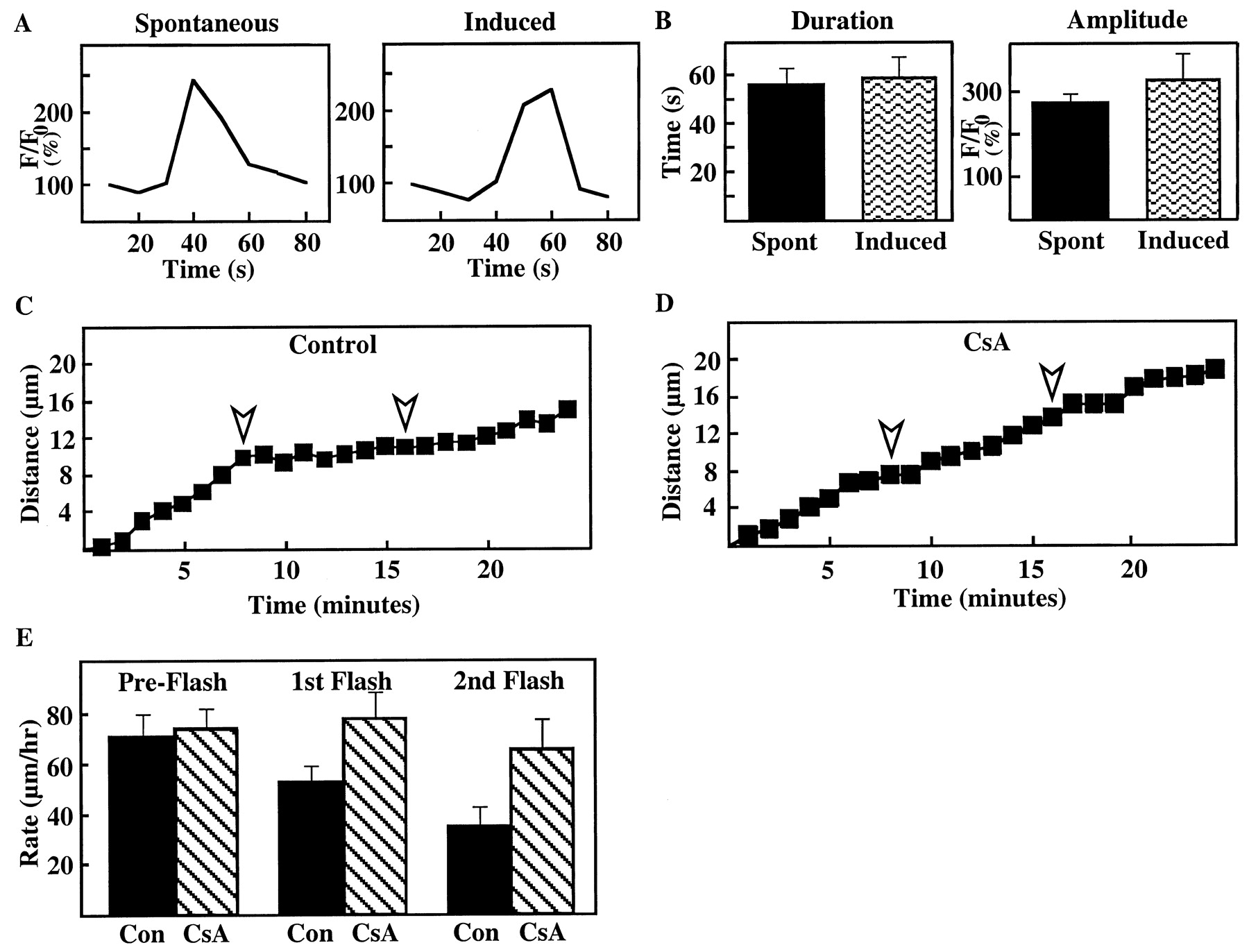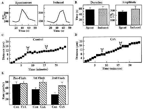 Inhibition of calcineurin suppresses the slowing of neurite outgrowth by Ca2+ transients generated by photorelease of caged Ca2+. A, UV stimulation of a growth cone elicits a Ca2+transient (right; laminin substrate) that mimics a spontaneous Ca2+ wave in a different growth cone (left; tissue culture plastic substrate).B, Induced Ca2+ transients mimic spontaneous growth cone Ca2+ waves in both duration and amplitude (mean ± SEM; n = 5).C, Growth cone Ca2+ transients evoked at 8 min intervals (arrowheads) inhibit the rate of outgrowth. D, Inhibition of calcineurin (CsA, 10 nM) negates the braking effect of Ca2+transients (arrowheads) on neurite outgrowth. Neurons were imaged to establish a baseline rate of outgrowth, followed by photorelease of Ca2+ in the growth cone at 8 min intervals to mimic growth cone waves. E, Inhibition of neurite outgrowth by Ca2+ transients is suppressed in the presence of CsA (10 nM), suggesting that activation of calcineurin slows neurite outgrowth (mean ± SEM;n ⥠15; p > 0.05).Con, Control; Spont, spontaneous. |