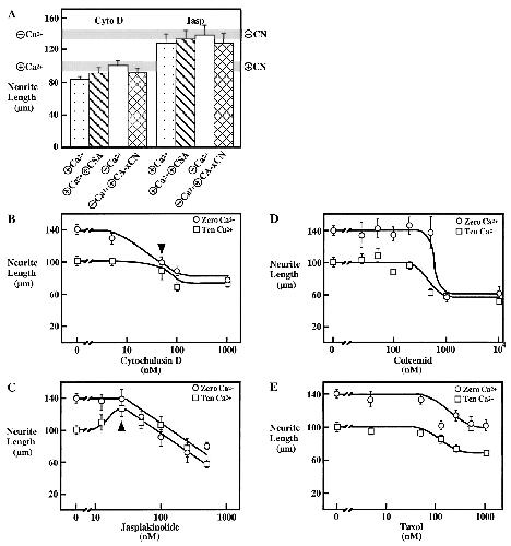 Disruption or stabilization of actin mimics the effects of activation or inhibition of CN. A, Shaded horizontal barsindicate neurite lengths in the presence of Ca2+ and CN activity and in their absence (see Fig. 1). Disruption of actin with Cyto D (50 nM) results in shorter neurites in the absence of CN activity, whereas stabilization of actin with Jasp (25 nM) generates longer neurites in the presence of CN activity. See text for further details. B,C, Doseâresponse analyses reveal the concentrations of Cyto D and Jasp (arrowheads) that mimic the effect of activating or inhibiting CN on neurite outgrowth. Disruption of actin filaments with Cyto D (50 nM; B) inhibits outgrowth in the absence of Ca2+ but not in its presence, whereas Jasp (25 nM; C) increases neurite lengths in its presence of Ca2+ but not in its absence. D, E, Doseâresponse analyses demonstrate that destabilization or stabilization of microtubules with colcemide (D) or taxol (E) results in a Ca2+-independent inhibition of neurite outgrowth. Data are mean ± SEM (n ⥠30).CSA, CsA. |