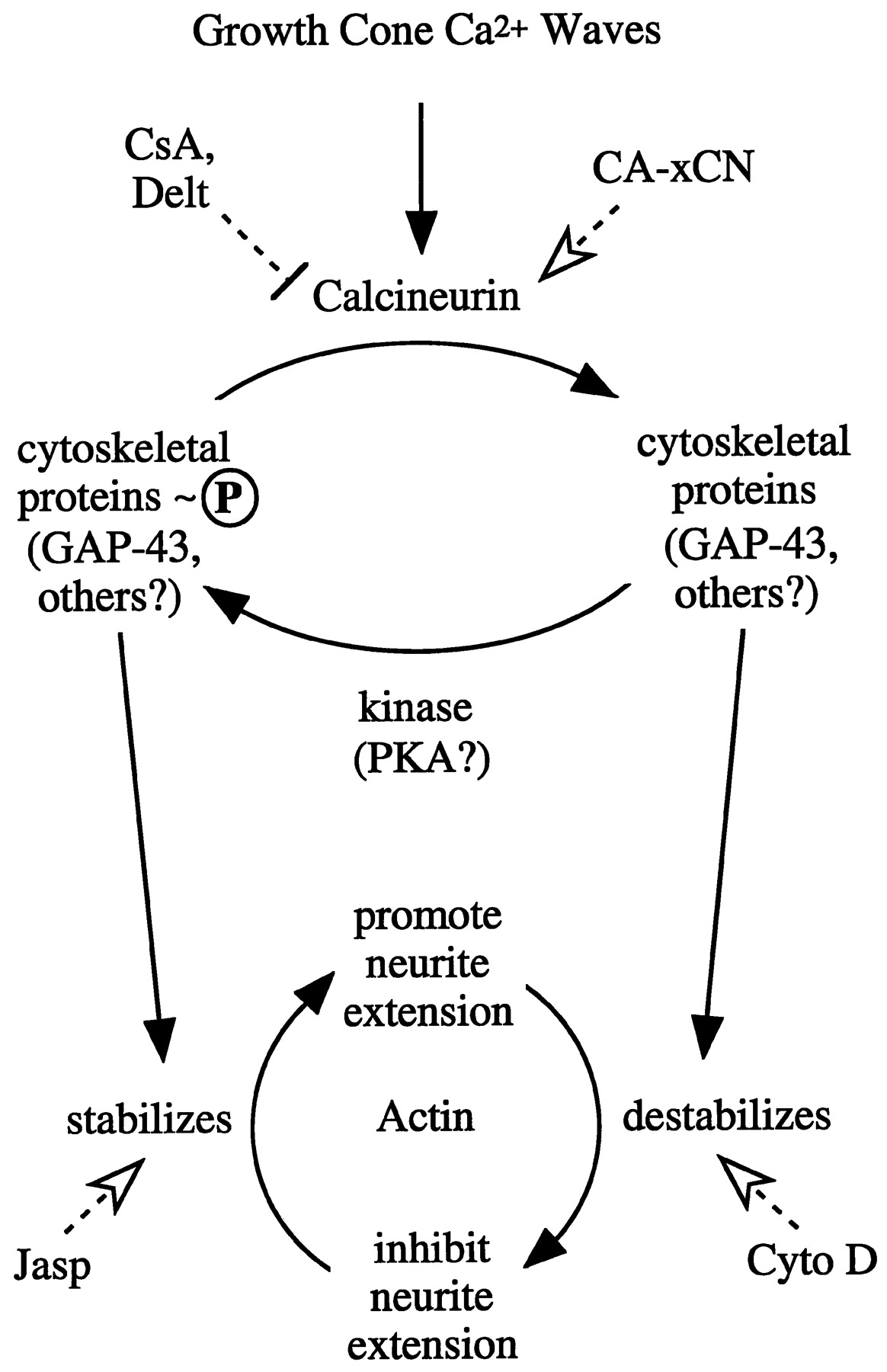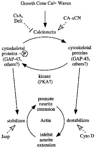Model of the signal transduction cascade by which Ca2+ waves act via CN to regulate neurite extension. Ca2+ waves activate CN, shifting cytoskeletal-regulating proteins to a dephosphorylated state, destabilizing actin filaments, and inhibiting neurite elongation. CN is not activated in the absence of Ca2+ waves, shifting cytoskeletal-regulating proteins to a phosphorylated state, stabilizing actin filaments, and promoting neurite outgrowth. Activating or inhibiting this cascade at different points increases or decreases neurite extension. Delt, DM. |