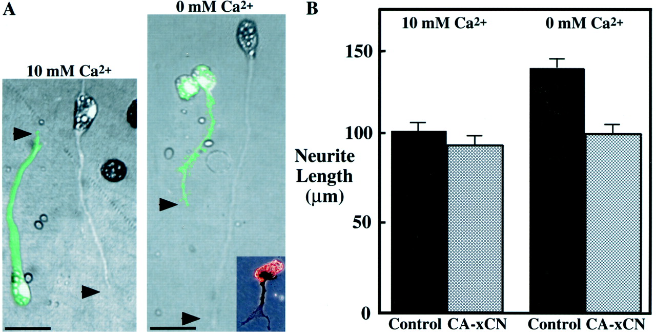 Expression of a constitutively active xCN construct leads to short neurites in the absence of Ca2+. A, Myc-tagged CA-xCN A cRNA was coinjected into one cell of a two-cell stage embryo with mouse CN B cRNA to enhance enzymatic activity and a fluorescent lineage tracer (FITC-dextran) to identify CA-xCN-expressing cells. Nonfluorescent neurons are internal controls. Arrowheads indicate growth cones. Inset shows a myc-labeled neuron at 1 d in culture is shown. Neurons were grown ±Ca2+. Scale bars, 25 μm. B, Neurite extension is significantly inhibited in neurons expressing CA-xCN in the absence of external Ca2+ (p < 0.01). Neurons expressing CA-xCN grown in the presence of Ca2+ have neurite lengths similar to those of controls. Data are mean ± SEM (n ⥠100). |