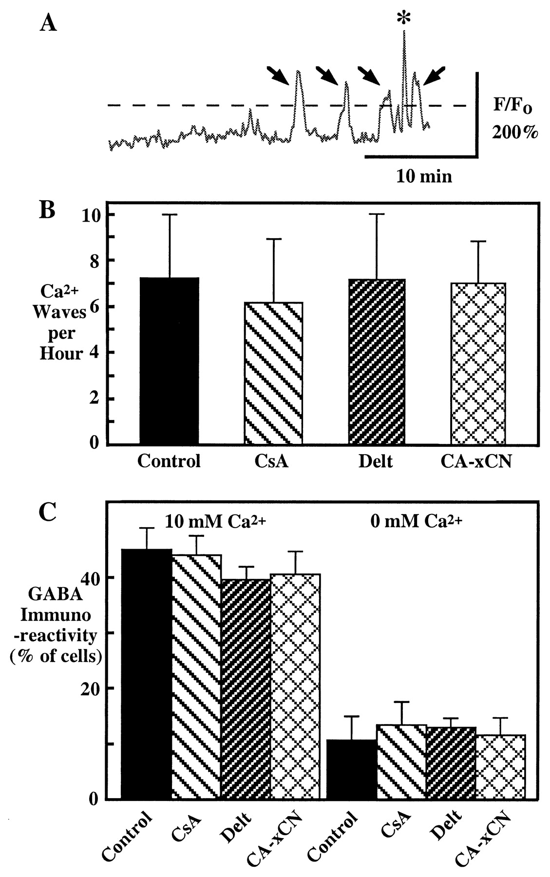 Ca2+ wave frequency and Ca2+-dependent expression of GABA are not affected by inhibition or activation of CN. A, Spontaneous Ca2+ waves are shown. Intracellular Ca2+ was monitored using the Ca2+indicator dye Fluo 3, and images were acquired at 10 sec intervals in the presence of 1 nM DM. Arrows indicate events scored as waves, the asterisk denotes a Ca2+ spike, and the dashed lineindicates the event threshold. B, Inhibition of CN does not significantly affect the frequency of Ca2+ waves: control, 7 ± 3/hr; CsA (10 nM), 6 ± 3/hr; DM (Delt, 1 nM), 7 ± 3/hr. Neurons expressing CA-xCN, indicated by the fluorescence of fura-2-dextran, generate spontaneous Ca2+ waves at normal frequencies in growth cones: control, 7 ± 3/hr; CA-xCN, 7 ± 2/hr. Neurons were imaged for 30 min intervals. Data are mean ± SEM (n⥠15). C, Neurons treated with either 10 nMCsA or 1 nM DM were assayed for expression of GABA with a rabbit anti-GABA polyclonal antibody. CN-inhibited neurons express the same extent of GABA immunoreactivity as controls. Reciprocal experiments with neurons expressing CA-xCN, confirmed by myc immunoreactivity, demonstrate no effect on GABA expression. Data are mean ± SEM (n ⥠100). |