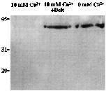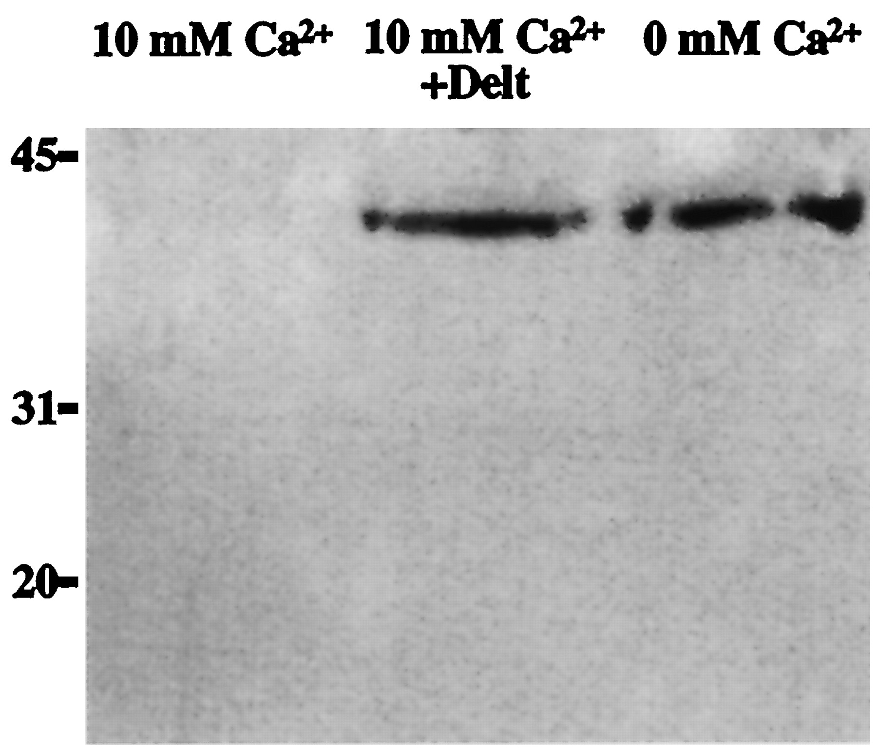 Ca2+ waves act via calcineurin to dephosphorylate GAP-43. A Western blot of extracts of cultured neurons grown in the presence of Ca2+ and Ca2+ + DM (Delt, 1 nM) and in the absence of Ca2+ demonstrates that GAP-43 phosphorylation is lower in the presence of Ca2+ and that inhibiting calcineurin returns this phosphorylation to levels similar to those observed in the absence of Ca2+(n = 7). |