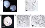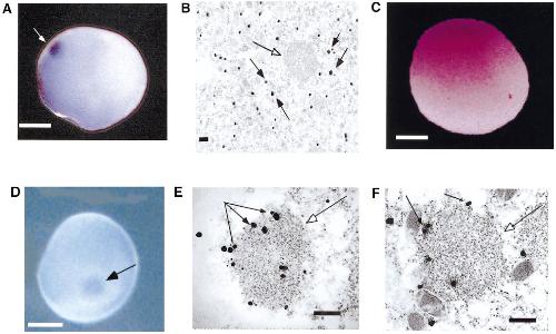 to the germinal granules. Solid arrows point to either the cloud (A and D) or the silver-enhanced gold particles (B, E, and F). Open arrows