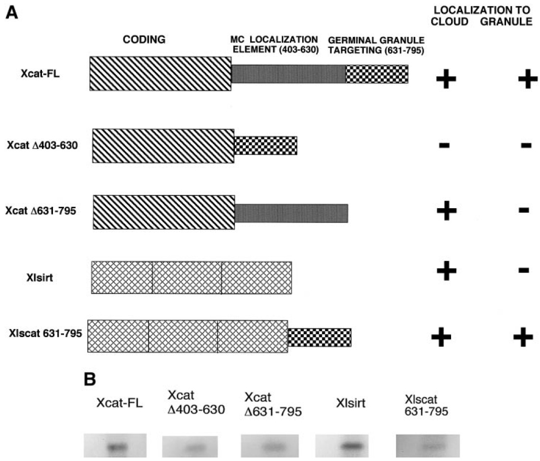 mitochondrial cloud (cloud) and germinal granules (granule). (A) Xcat-FL is the full-length Xcat2 mRNA, Xcat D403-630 has the MCLE