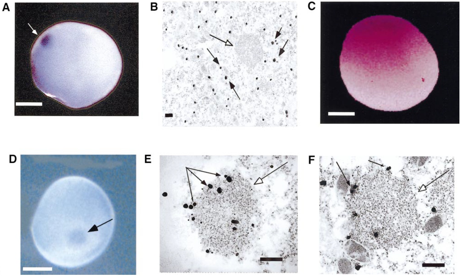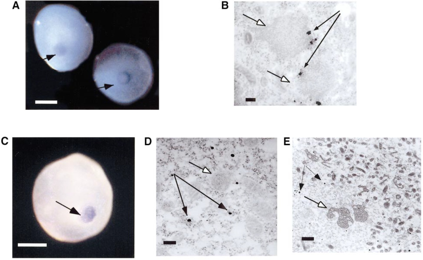 (1999). Bar, 100 mm. (B) EM analysis of germ plasm region of mitochondrial cloud showing silver-enhanced gold particles associated with