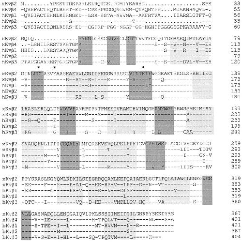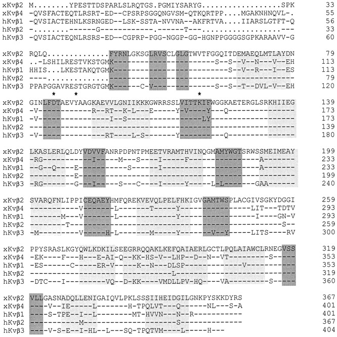Xenopus Kvβ subunits. The predicted amino acid sequences of Xenopus xKvβ2 and xKvβ4 coding regions are aligned against mammalian Kvβ1, Kvβ2, and Kvβ3 sequences [hKvβ1.1 and hKvβ2.1 (McCormack et al., 1995); hKvβ3.1 (Leicher et al., 1998)]. Gaps (dots) have been introduced to improve the alignment. Residues that are identical to those of xKvβ2 are indicated by a hyphen. Overall, xKvβ2 and xKvβ4 share 71% identity at the amino acid level (Table 1). α-Helices and β-sheets are shadedlight and dark gray, respectively; residues that contribute to the putative active site are indicated by an overlying asterisk (Gulbis et al., 1999). |