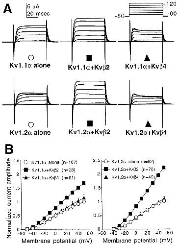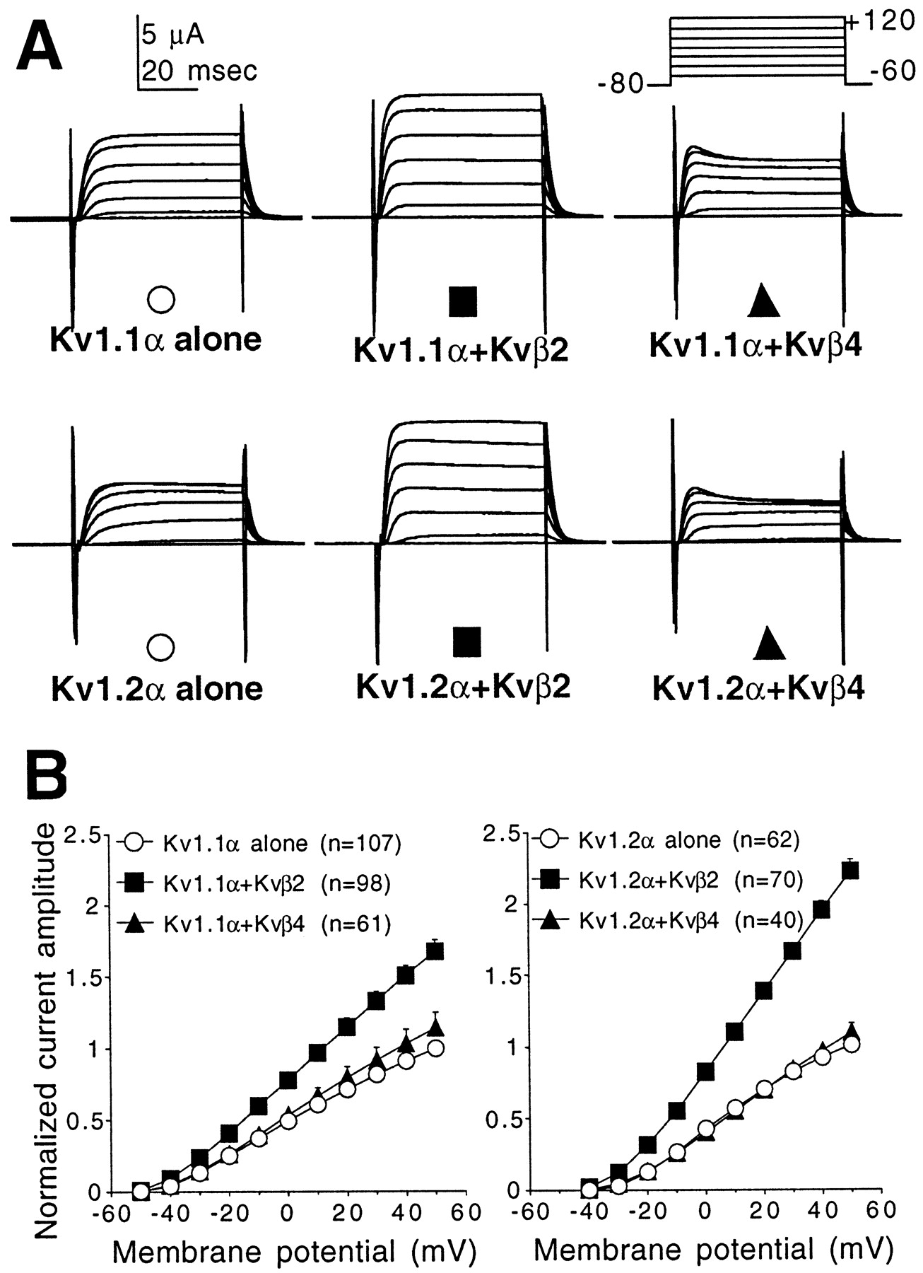Coexpression of xKvβ2, but not xKvβ4, with xKv1.1α or xKv1.2α subunits leads to an increase in current amplitude. A, Representative whole-oocyte recordings of currents induced after injection of Kv1.1α (top) and Kv1.2α (bottom) RNAs in the absence (left) or presence of xKvβ2 (middle) or xKvβ4 RNA (right). Currents were elicited by depolarizing the membrane in 10 mV increments to potentials ranging between â60 and +130 mV from a holding potential of â80 mV; currents elicited by depolarizations to â60, â30, 0, +30, +60, +90, and + 120 mV are shown. B, Normalized currentâvoltage (IâV) relationships for currents recorded from oocytes injected with xKv1.1α (left) and Kv1.2α (right) ±xKvβ2 or xKvβ4 RNAs. Current amplitudes were normalized to the mean current amplitude obtained at +50 mV for xKv1.1α or Kv1.2α alone; numbers in parentheses =n. Data obtained in the presence of Kvβ2 (âª) are significantly different from those obtained in its absence (â);p ⤠0.0002. |