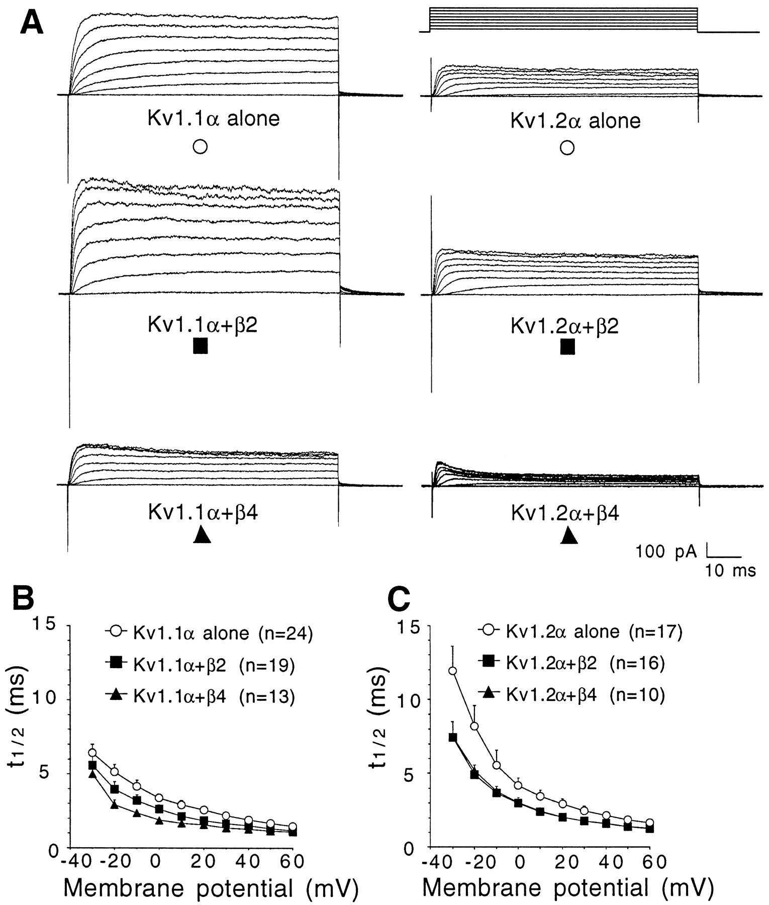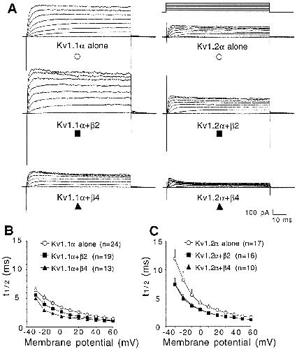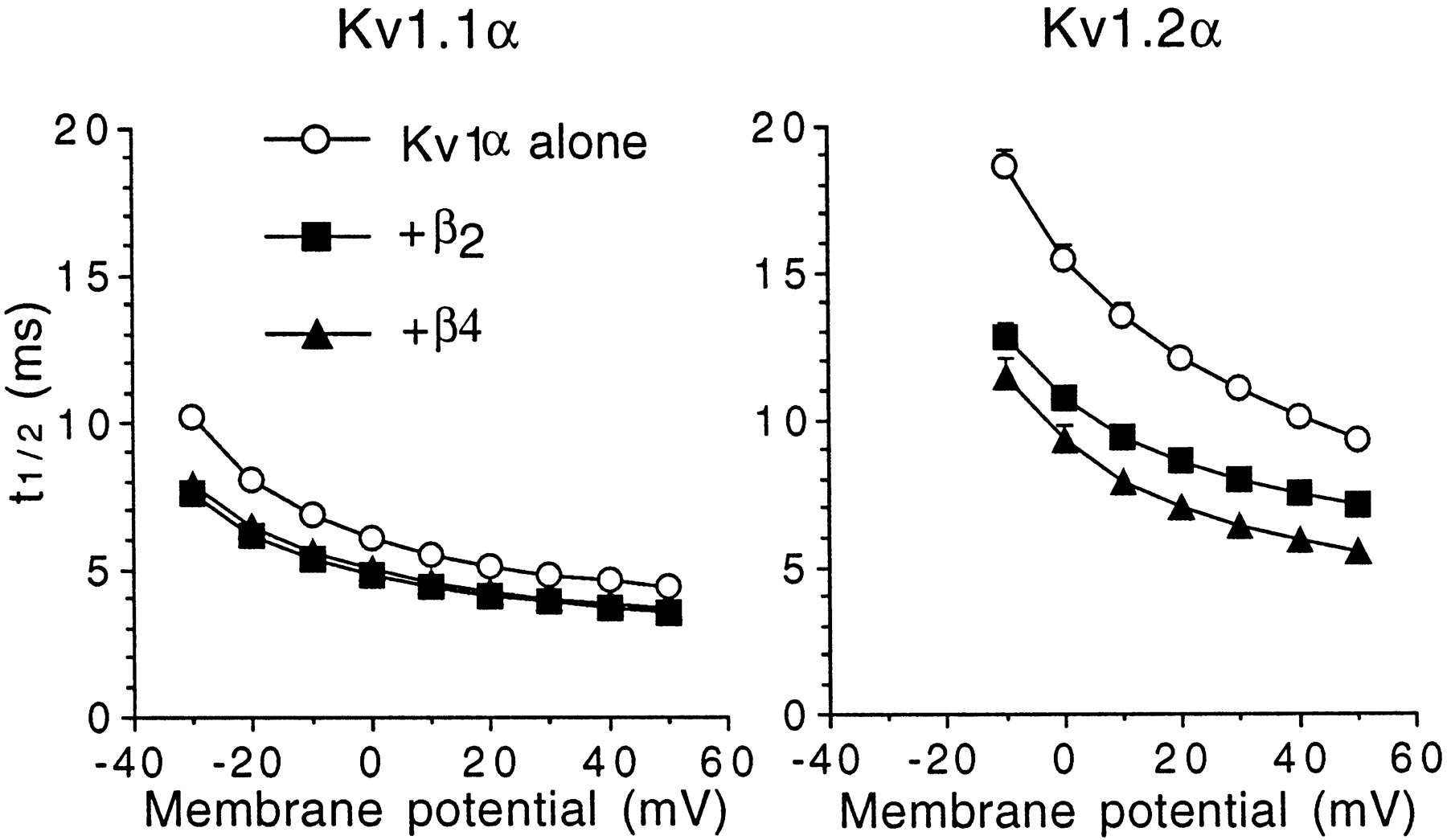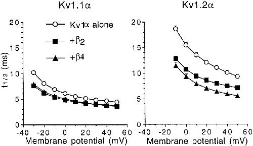 Coexpression of xKvβ with xKv1α subunits accelerates kinetics of activation. Time to half-maximum activation (t 1/2) as a function of voltage is plotted for recordings obtained from whole oocytes injected with Kv1.1α (left) or Kv1.2α (right) cRNAs in the absence and presence of xKvβ2 or xKvβ4 cRNAs. Representative currents are presented in Figure 3. Data obtained in the presence of either xKvβ are significantly different from those obtained in its absence; p values are all <0.0001. The number of oocytes recorded from are as follows: Kv1.1α alone, 72; Kv1.1α + xKvβ2, 70; Kv1.1α + xKvβ4, 35; Kv1.2α alone, 83; Kv1.2α + xKvβ2, 82; Kv1.2α + xKvβ4, 49. |