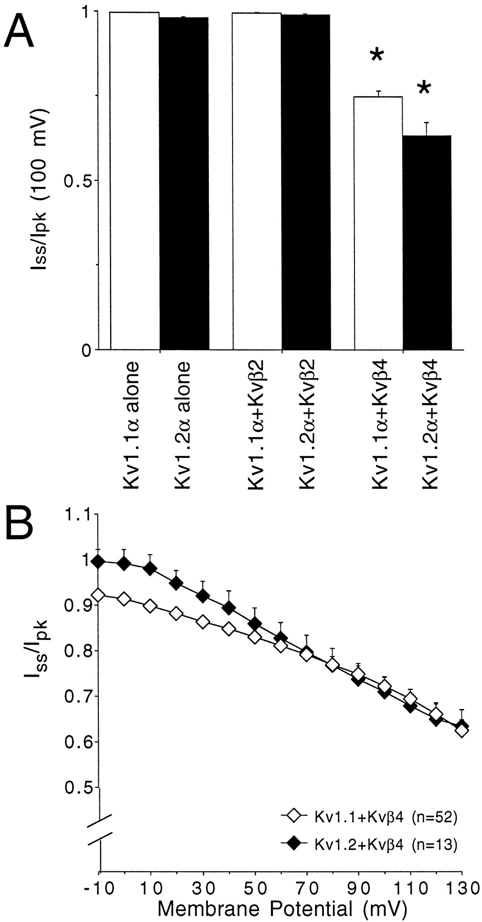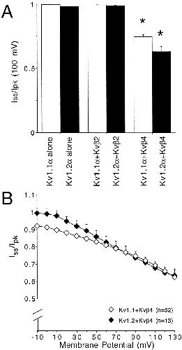 Coexpression of xKvβ4 induces inactivation of both xKv1.1α and xKv1.2α currents. A, Coexpression of xKvβ4, but not xKvβ2, induces inactivation of xKv1α channels (*p ≤ 0.0001 vs Kv1α alone). B, For both xKv1.1α and xKv1.2α subunits, coexpression of xKvβ4 induces a voltage-dependent inactivation; more inactivation is observed at stronger depolarizations. |