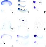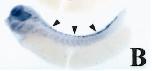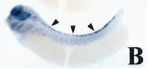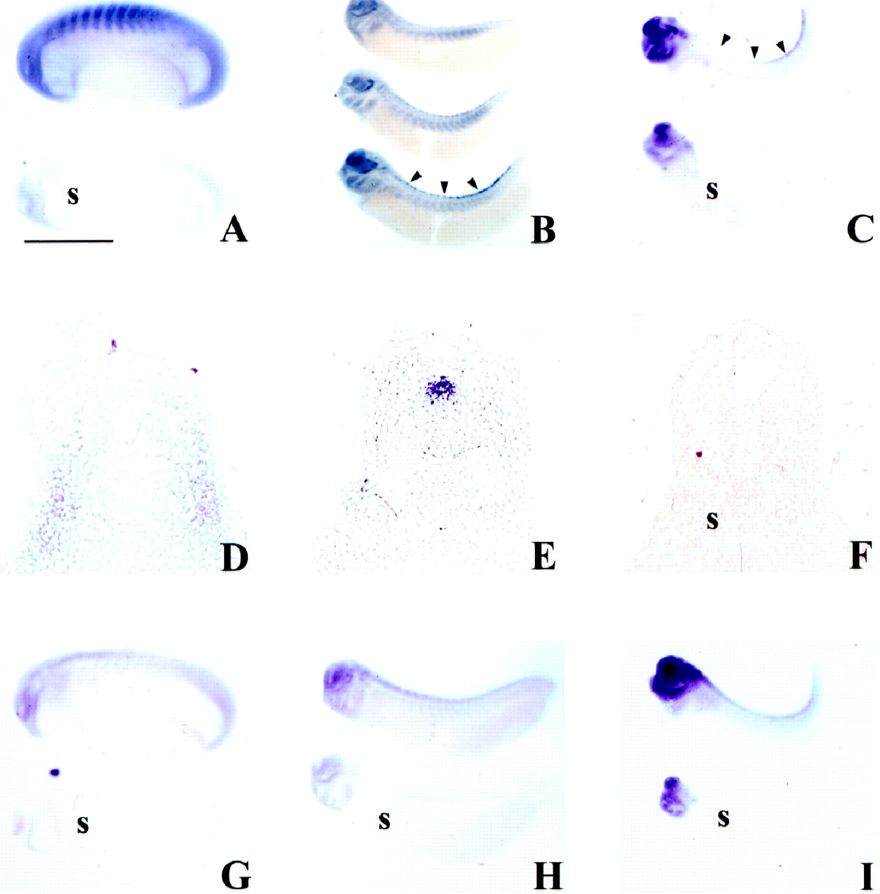 xKvβ2 and xKvβ4 transcripts are present in excitable tissues of developing Xenopus embryos. Embryos were hybridized as whole mounts to antisense or sense cRNA probes corresponding to either xKvβ2 (AâF) or xKvβ4 (GâI). The in situ hybridization signal is recognizable as a deep blue-purple precipitate. The whole-mount embryos (AâC, GâI) are oriented with their dorsal sides up and anterior ends to theleft. Embryos that were hybridized to sense control probes are identified by s; these demonstrate the background signal (caused by trapping of probe in internal cavities), which is higher in older embryos. The transverse sections(DâF) are oriented dorsal sideup. A, At 26 hr (St 24), xKvβ2 mRNA is prominent in developing somites. B, Between 1 and 2 d (top, middle, and bottom embryos are St 28, 29, and 30, respectively), the pattern of expression of xKvβ2 mRNA undergoes a dramatic change. Initially the signal predominates in the somites but with time diminishes in this tissue and begins to appear in the spinal cord (arrowheads). At St 35â36 (50 hr; C), the signal is no longer observed in the somites but is present in the spinal cord and head. D, In a transverse section through a 1 d embryo hybridized to xKvβ2 antisense probe, the signal is present in the developing somites. E, In a transverse section of a 2 d embryo hybridized to xKvβ2 antisense probe, the signal is detectable in the dorsal spinal cord, where Rohon-Beard cells reside. F, In a transverse section of a 2 d embryo hybridized to a sense control probe, no signal is present.GâI, Whole-mount embryos hybridized to xKvβ4 antisense probe. At all stages, the signal predominates in the nervous system. In the older embryos (e.g., I), the signal is stronger. Comparison of H andI (xKvβ4) with B and C(xKvβ2) reveals that xKvβ4 mRNA localizes to a more ventral position in the spinal cord than does xKvβ2. Scale bar:A, G, 1 mm; B,C, 1.5 mm; H, 1.2 mm;I, 1.1 mm; DâF, 700 μm. |