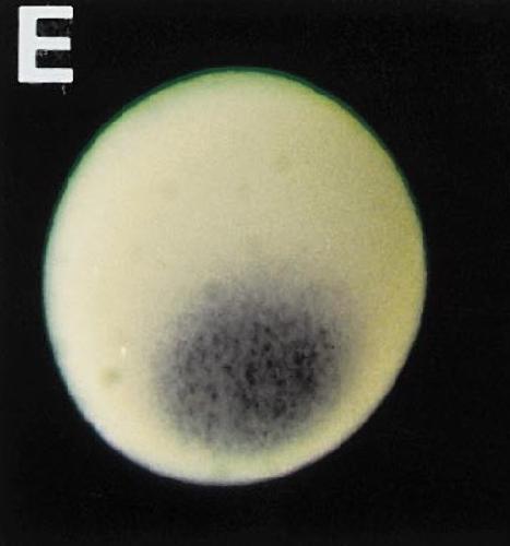 otx1 (orthodenticle homeobox 1) gene expression in Xenopus laevis embryo, assayed via in situ hybridization, oocyte stage IV, vegetal view.