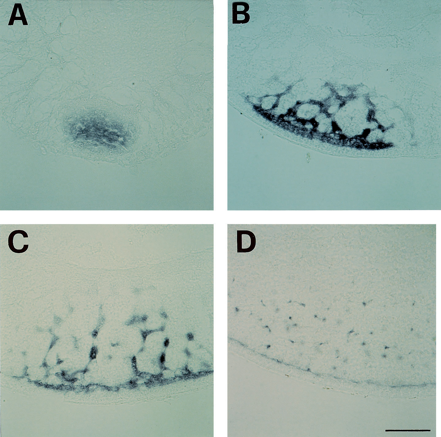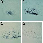 Fig. 3. Sections through oocytes of different stages hybridized with Xotx1. (A) Section of whole-mount of stage II oocyte showing Xotx1 transcripts within the mitochondrial cloud, that is quite near the vegetal cortex. (BâD) Section of whole-mount stage III, early and late stage IV oocyte respectively showing the anchoring of the mRNA to the vegetal cortex. The bar in D represents 200 μm.